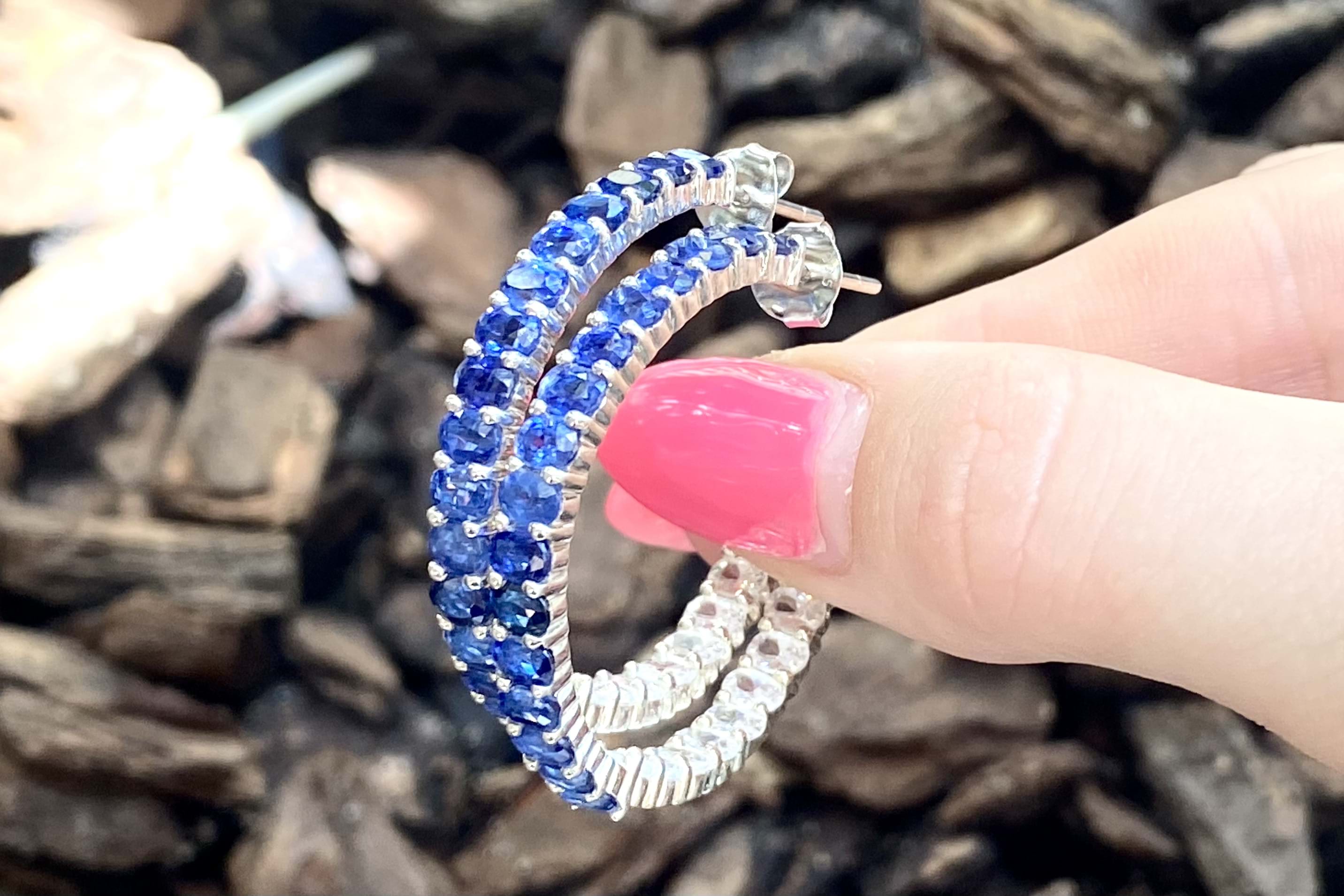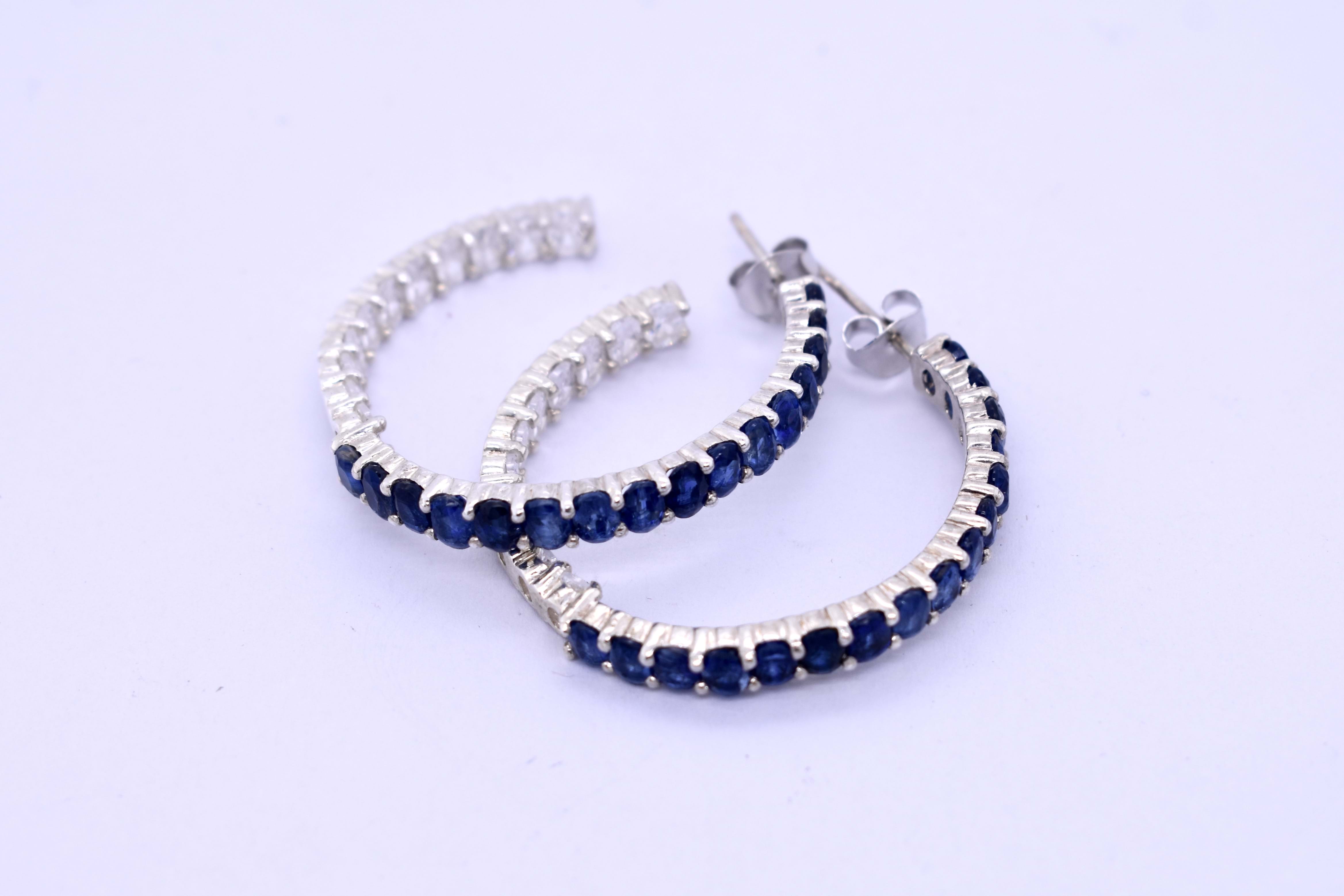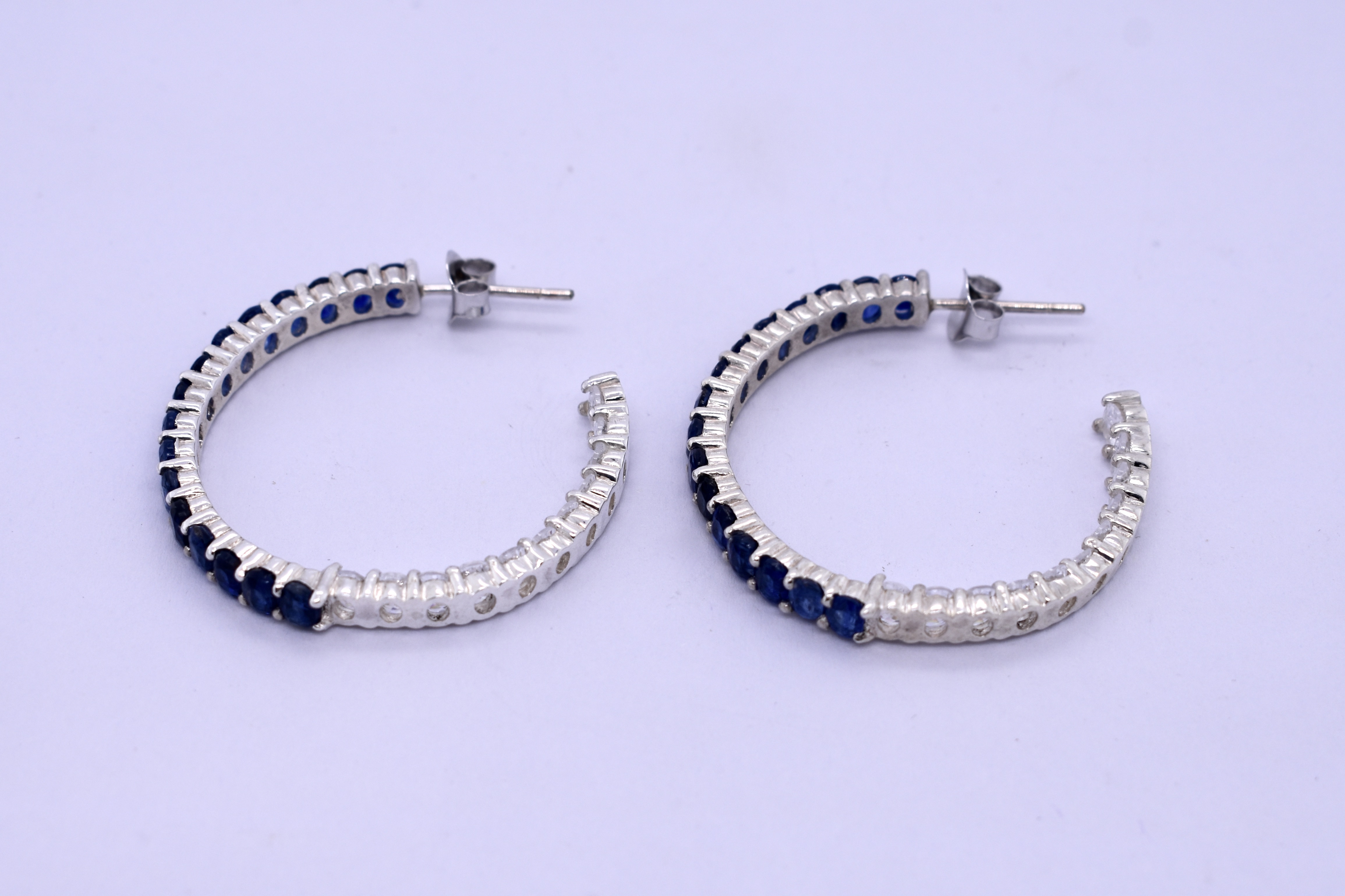 Crafted in sterling silver, this pair of pretty hoops measure 35mm round and are set with deep blue kyanite on the front and cubic zirconias on the inside. Complete with post and butterfly fittings.
