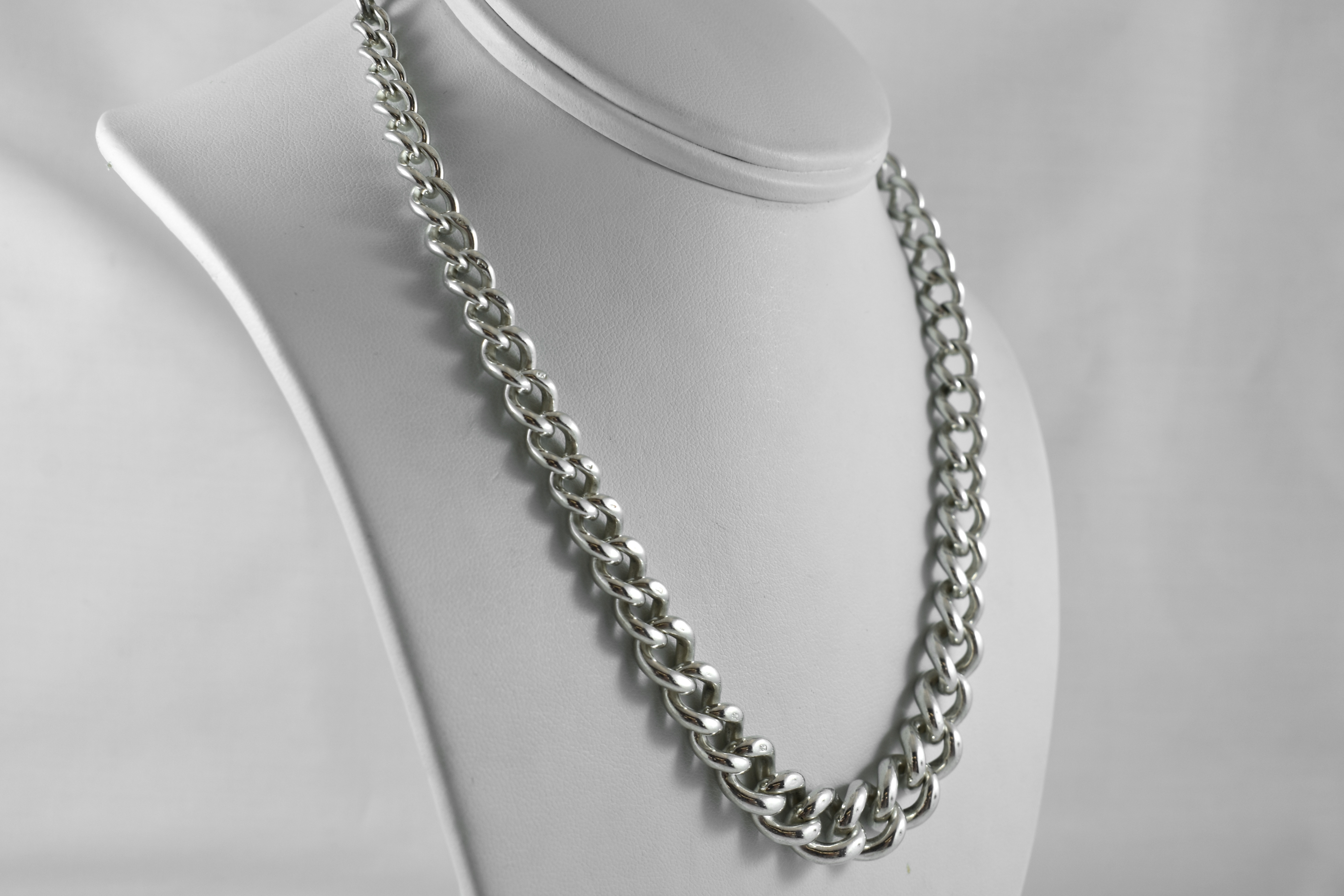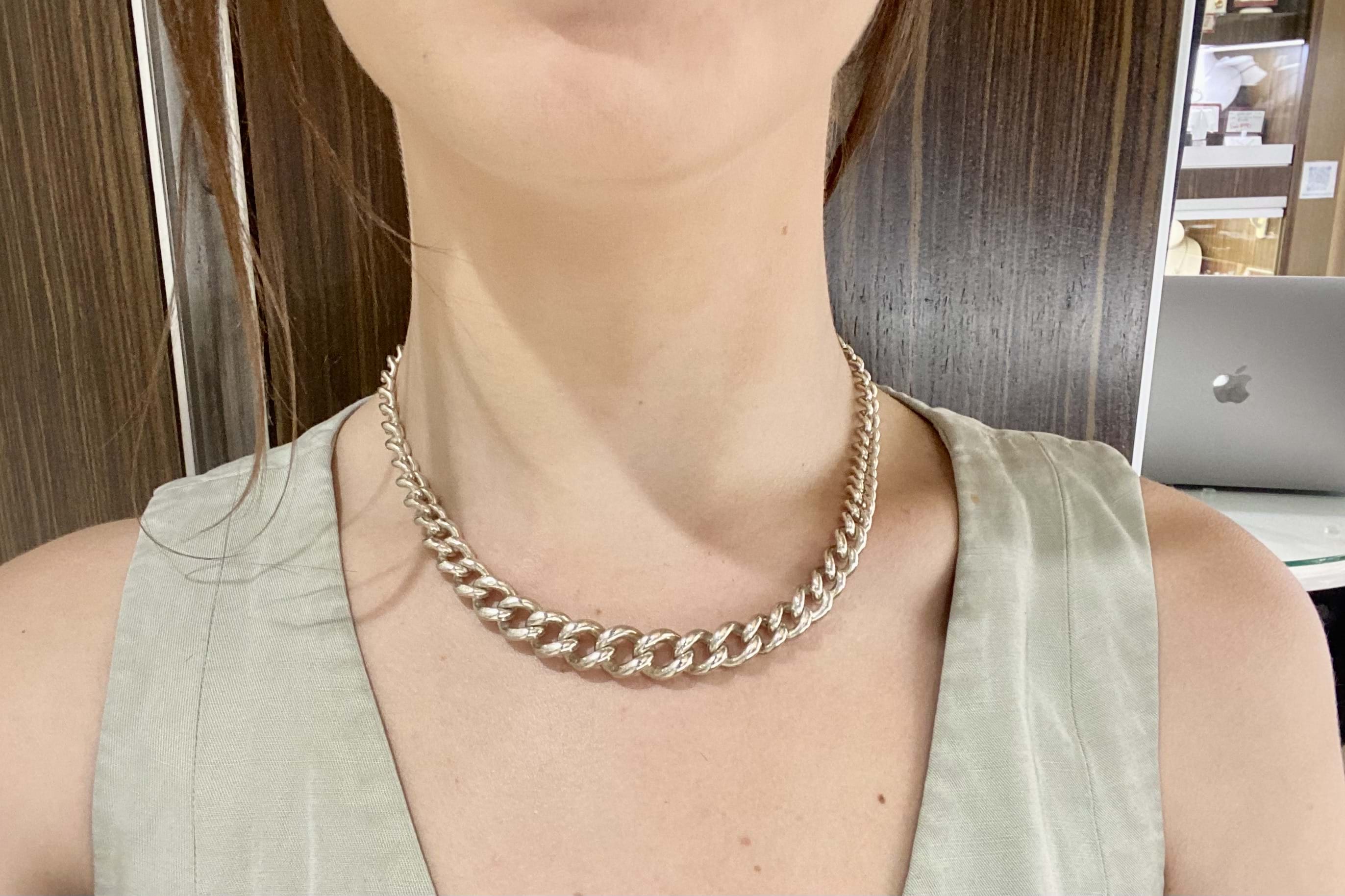 This chunky vintage graduated curb chain has been crafted in sterling silver, with a length of 44cm and weight of 59.9 grams. The graduated links range from 11-5mm wide and chain has an oval extension and swivel clasp.
