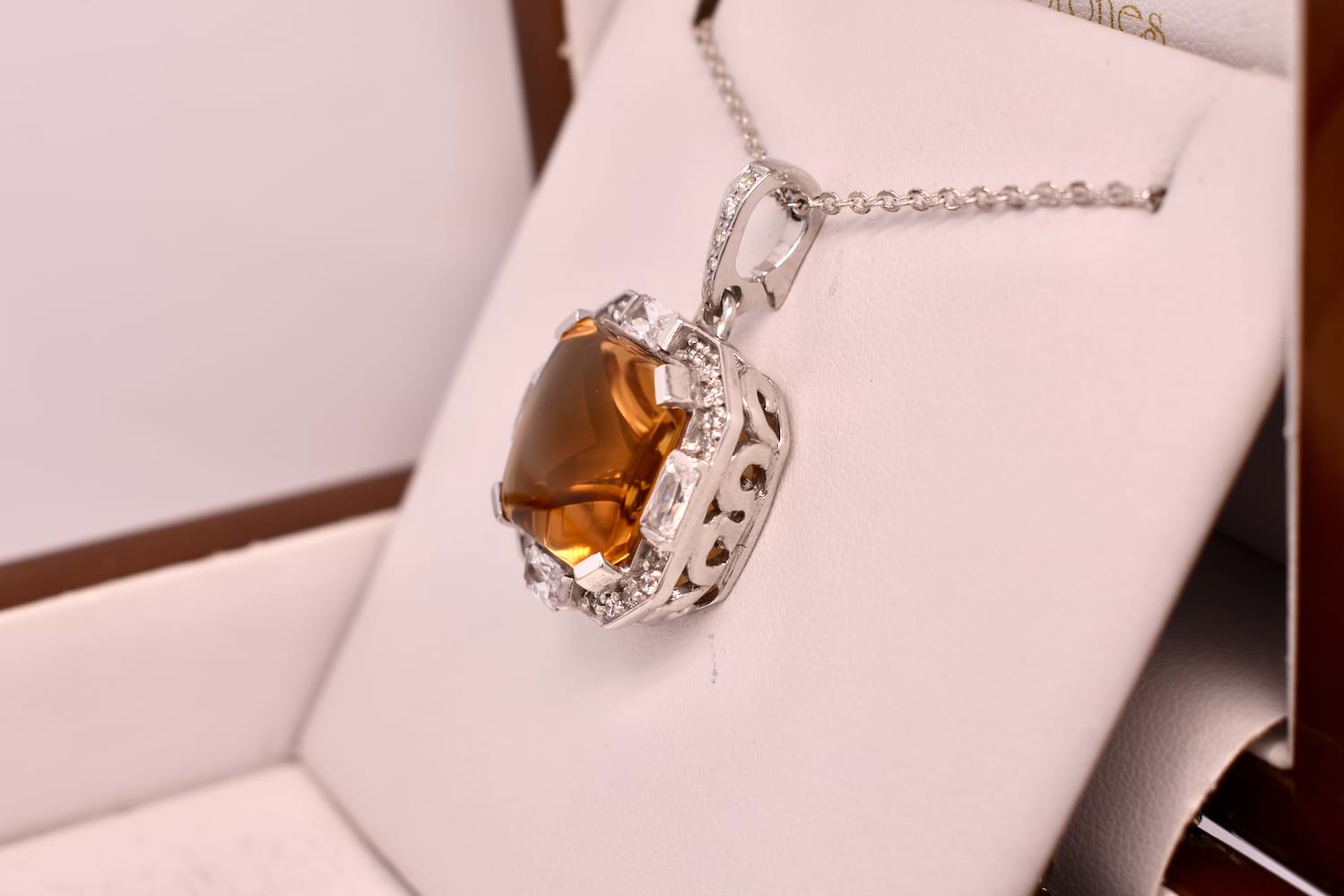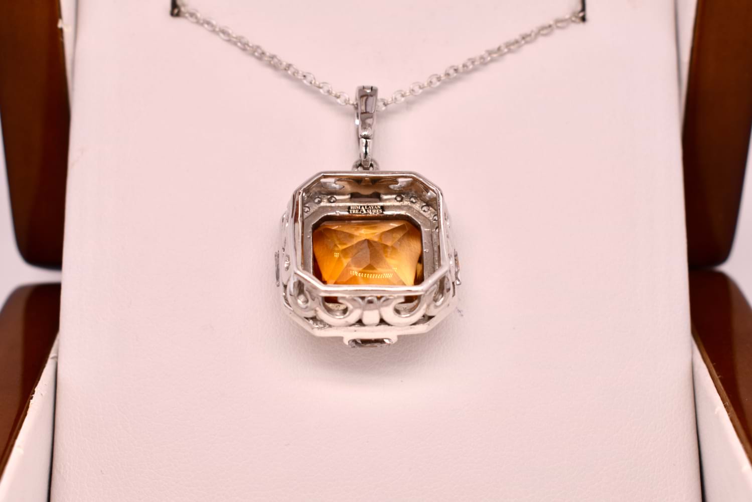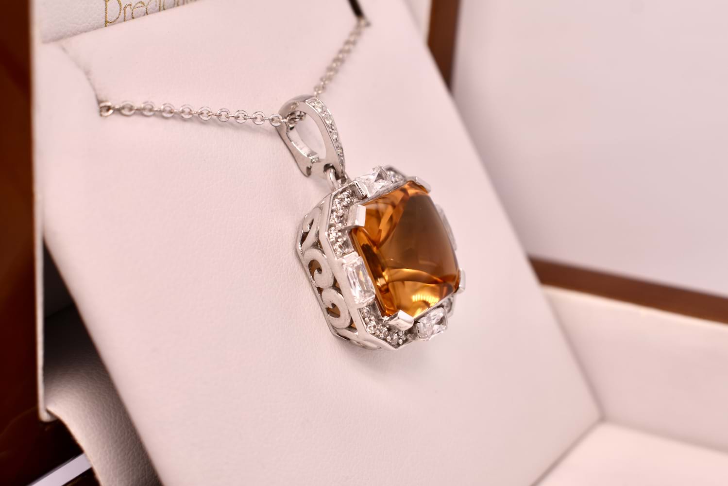 This fiery orange pendant features a cabochon citrine measuring approx. 34x11mm, square claw set in sterling silver and surrounded by a sparkling, geometric CZ halo. The enhancer bale is also encrusted with CZ's. The enhancer bale allows the piece to be worn on a fine chain as well as being clipped onto pearls, bolt rings and heavier link chains. Chains are available for separate purchase.