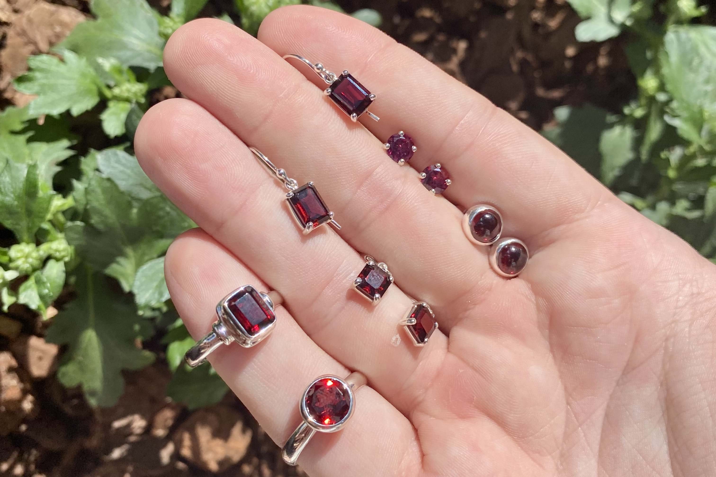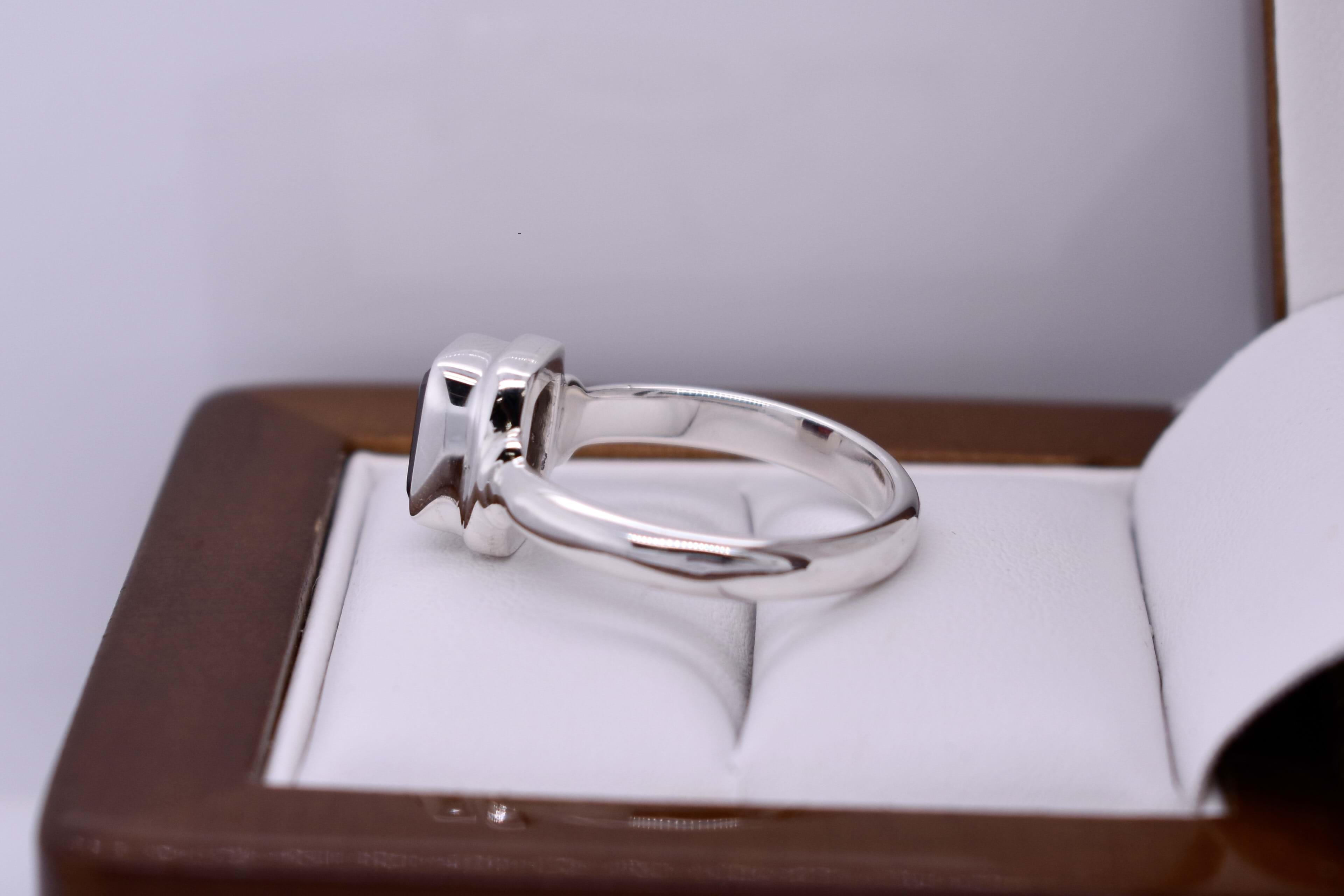The prettiest ring, featuring an emerald cut red garnet, measuring 10.3x8.5mm, set with a stepped bezel border in sterling silver. Completed with a plain band. Finger size N+.