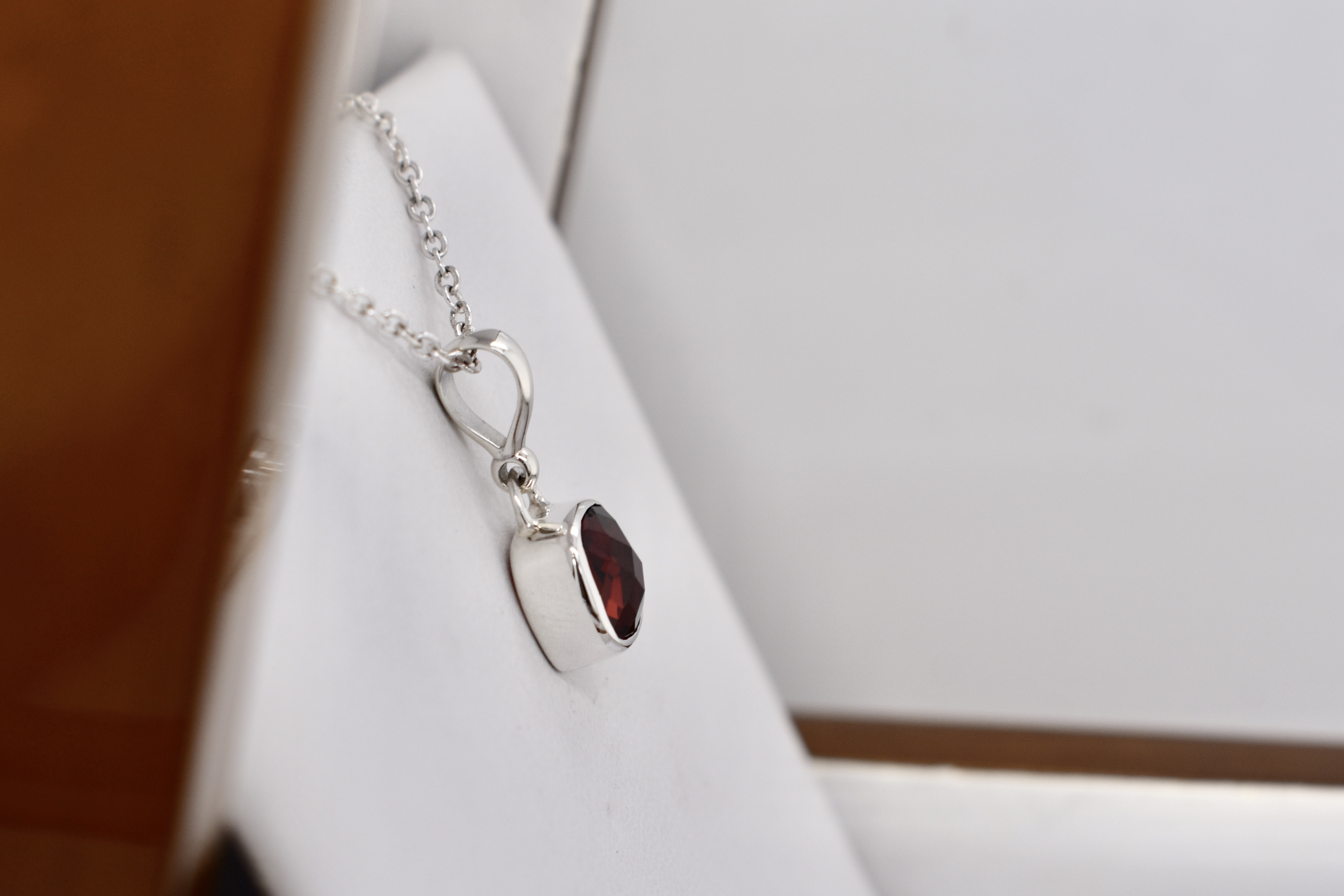 Alluring handmade sterling silver bezel set pendant, featuring a cushion shaped 7.5x7.5mm garnet, with a plain pendant bale. Chains are available for separate purchase.