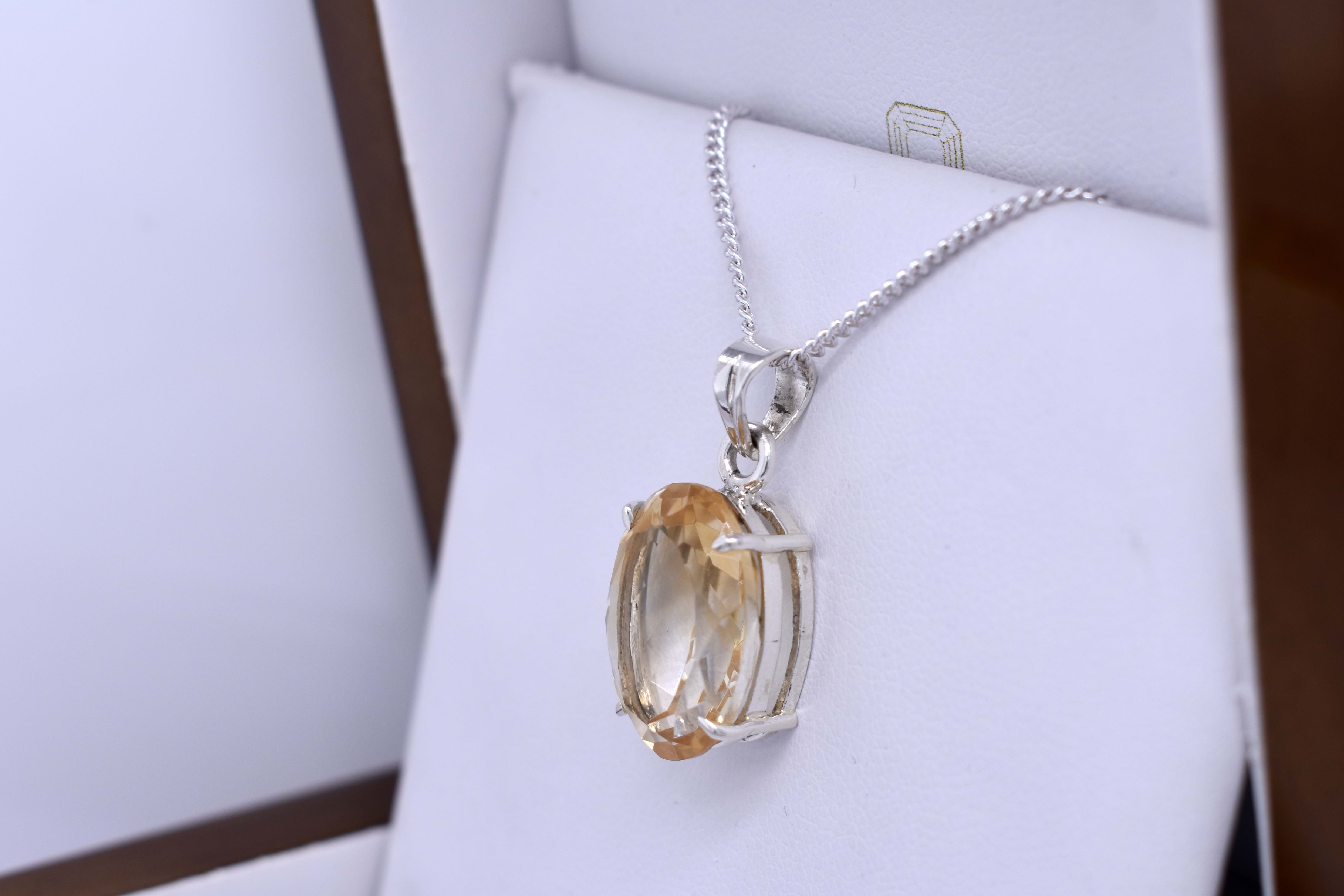 Crafted in sterling silver, this lovely light orange citrine oval shaped pendant, measuring 18x13mm and four claw set with a plain bale. Chains are available for separate purchase.