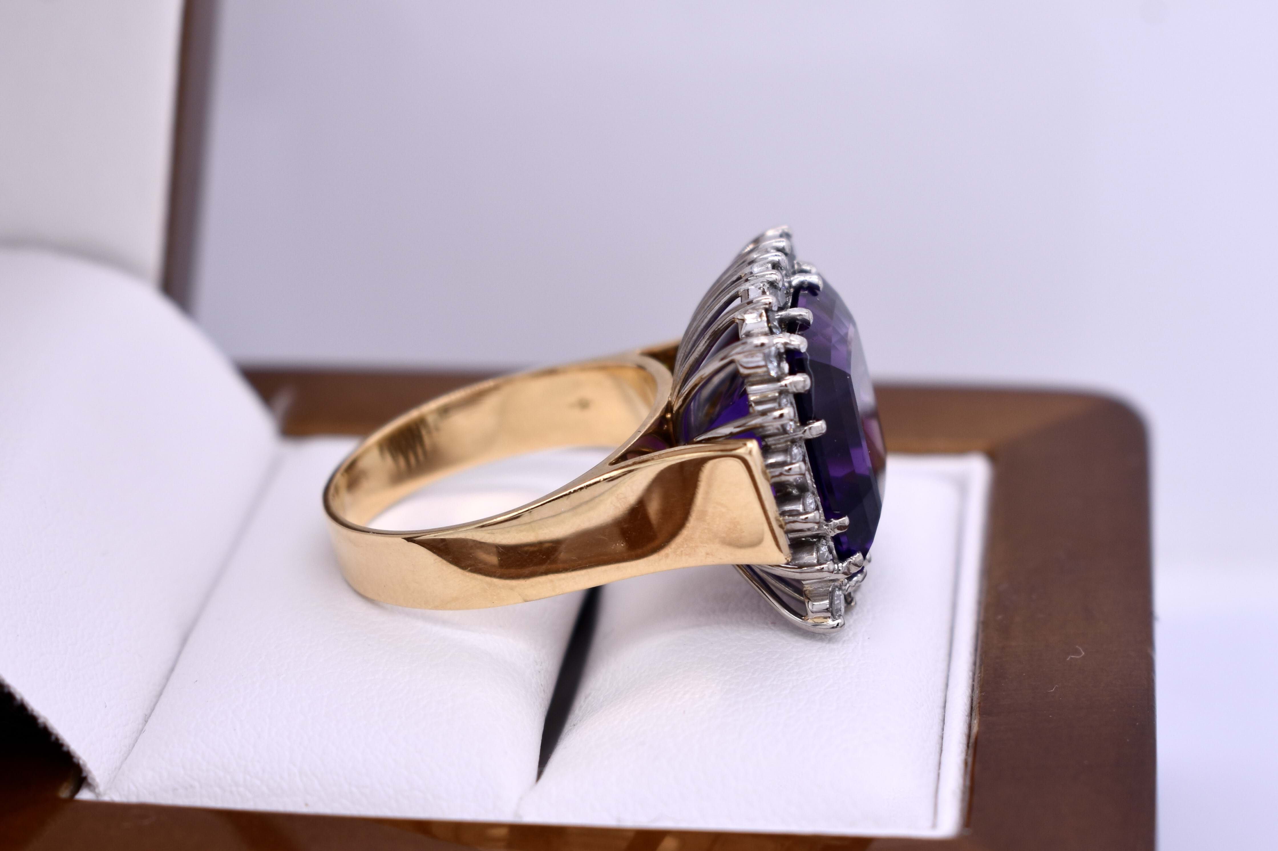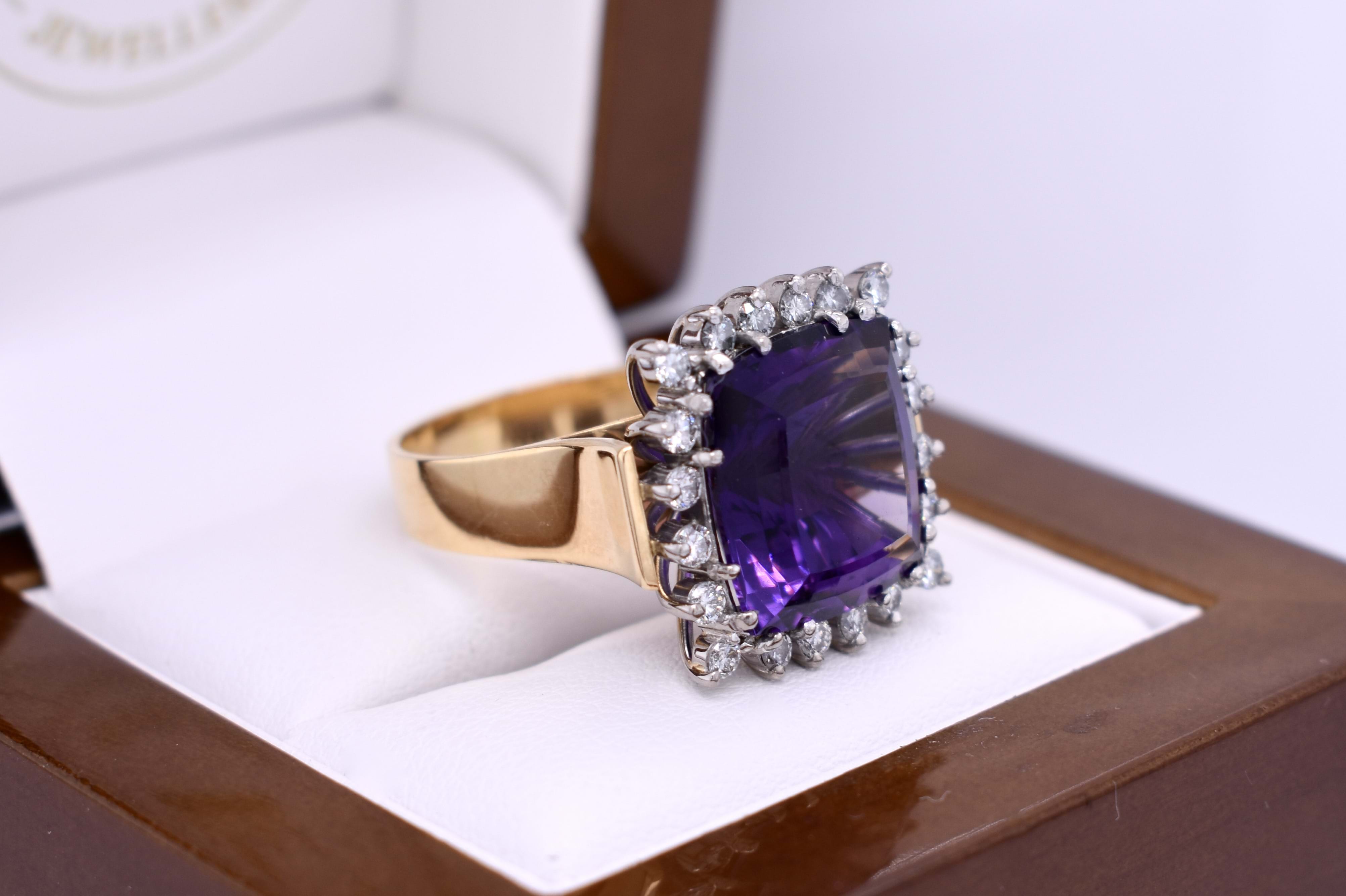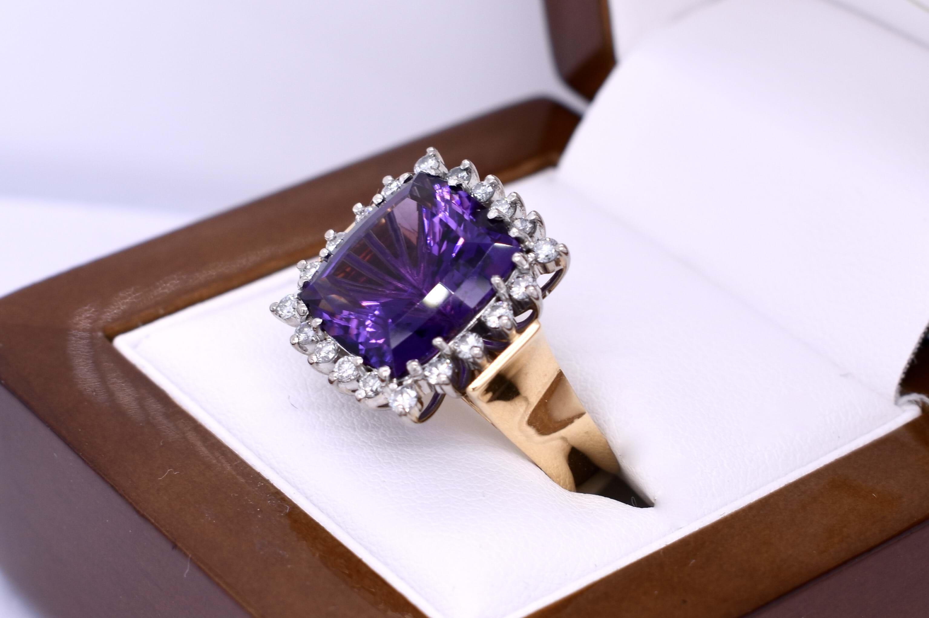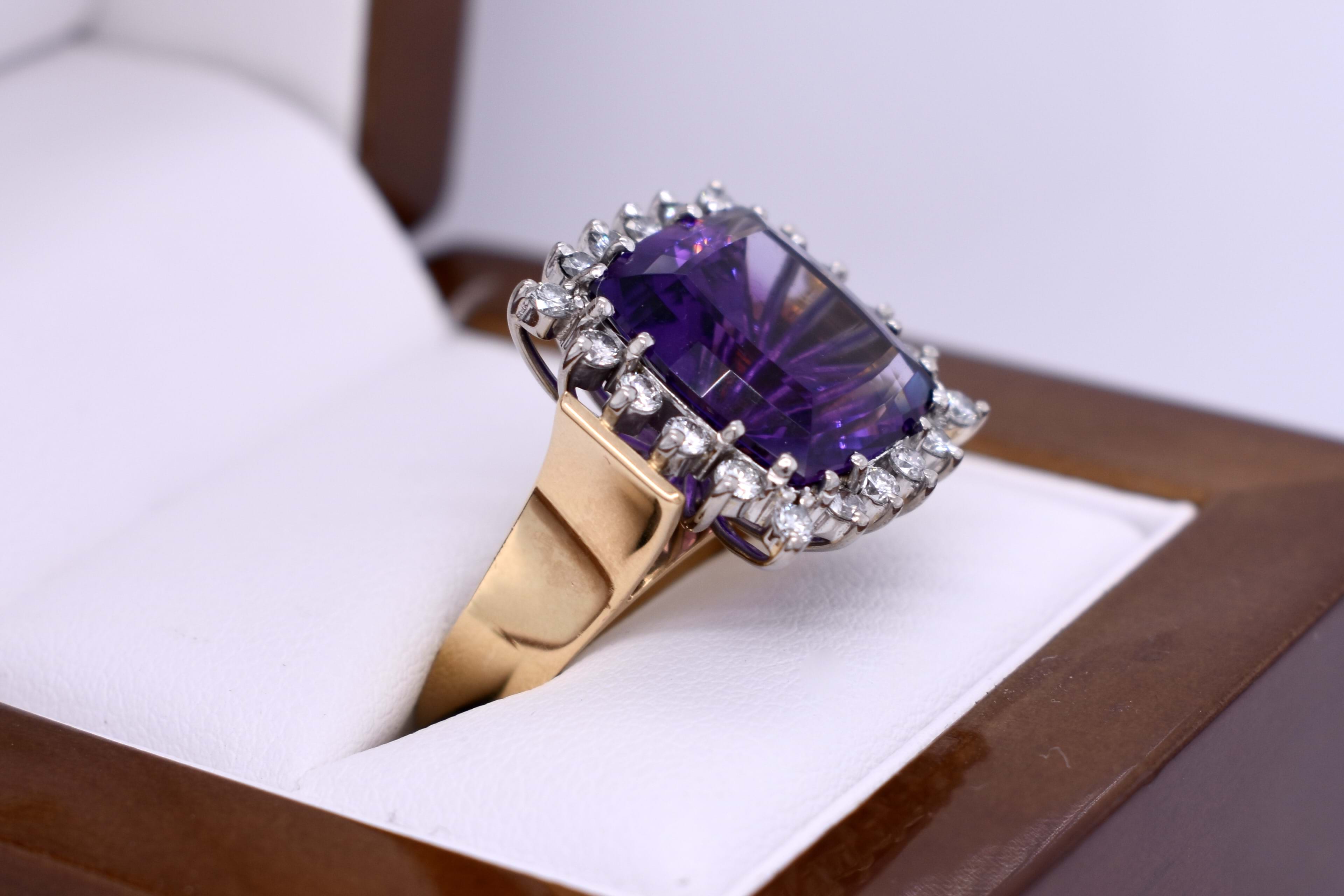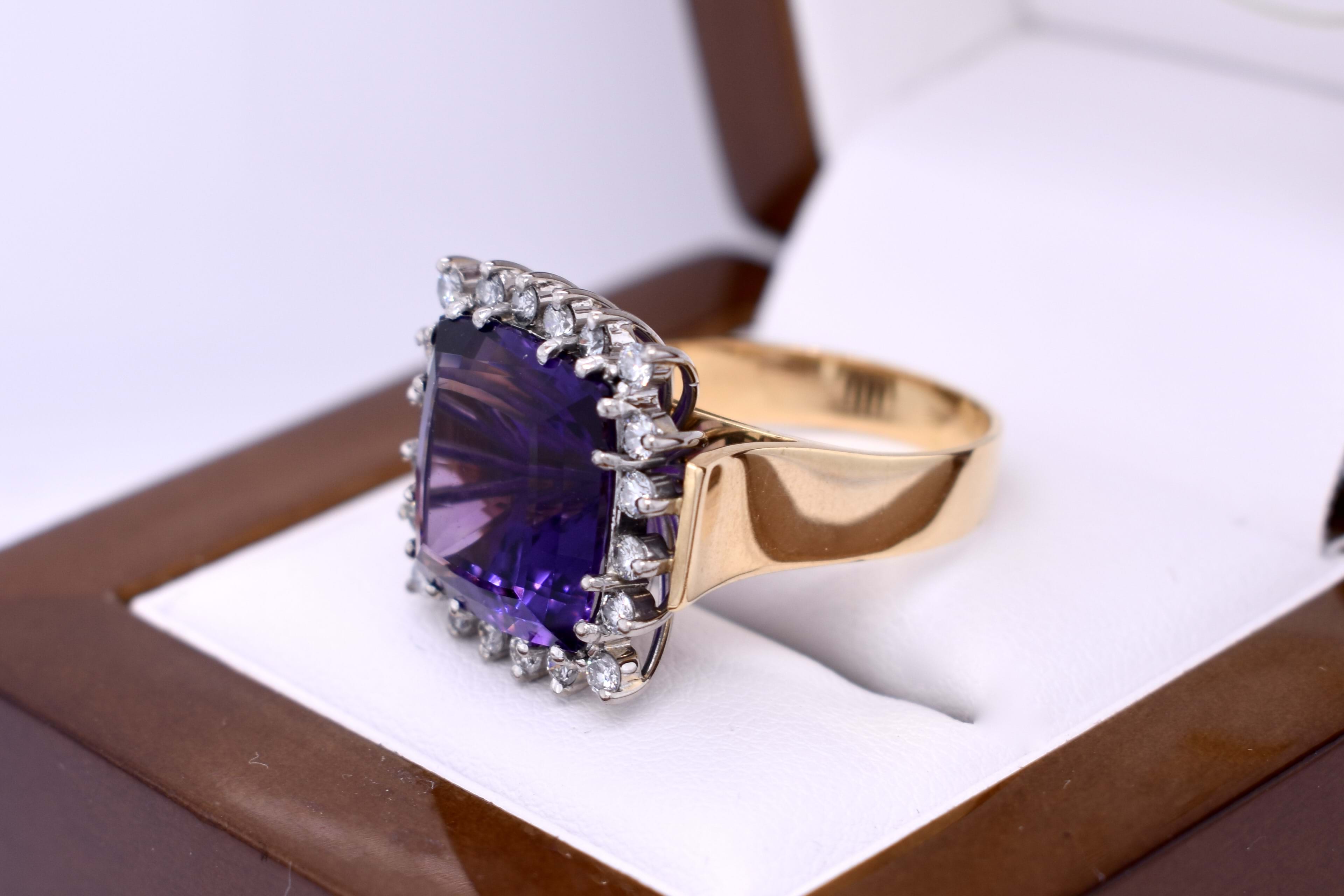 Stunning vintage handmade ring crafted in 18ct yellow and white gold, featuring a large 13.60x12.85mm square cushion cut bright deep purple amethyst. Surrounded by 20 round brilliant cut 1.90mm diamonds, grip and claw set in white gold, totalling 0.60ct H-I VS-SI. Finished on a yellow gold flat 3.82mm band. finger size O. Independent Valuation Supplied.