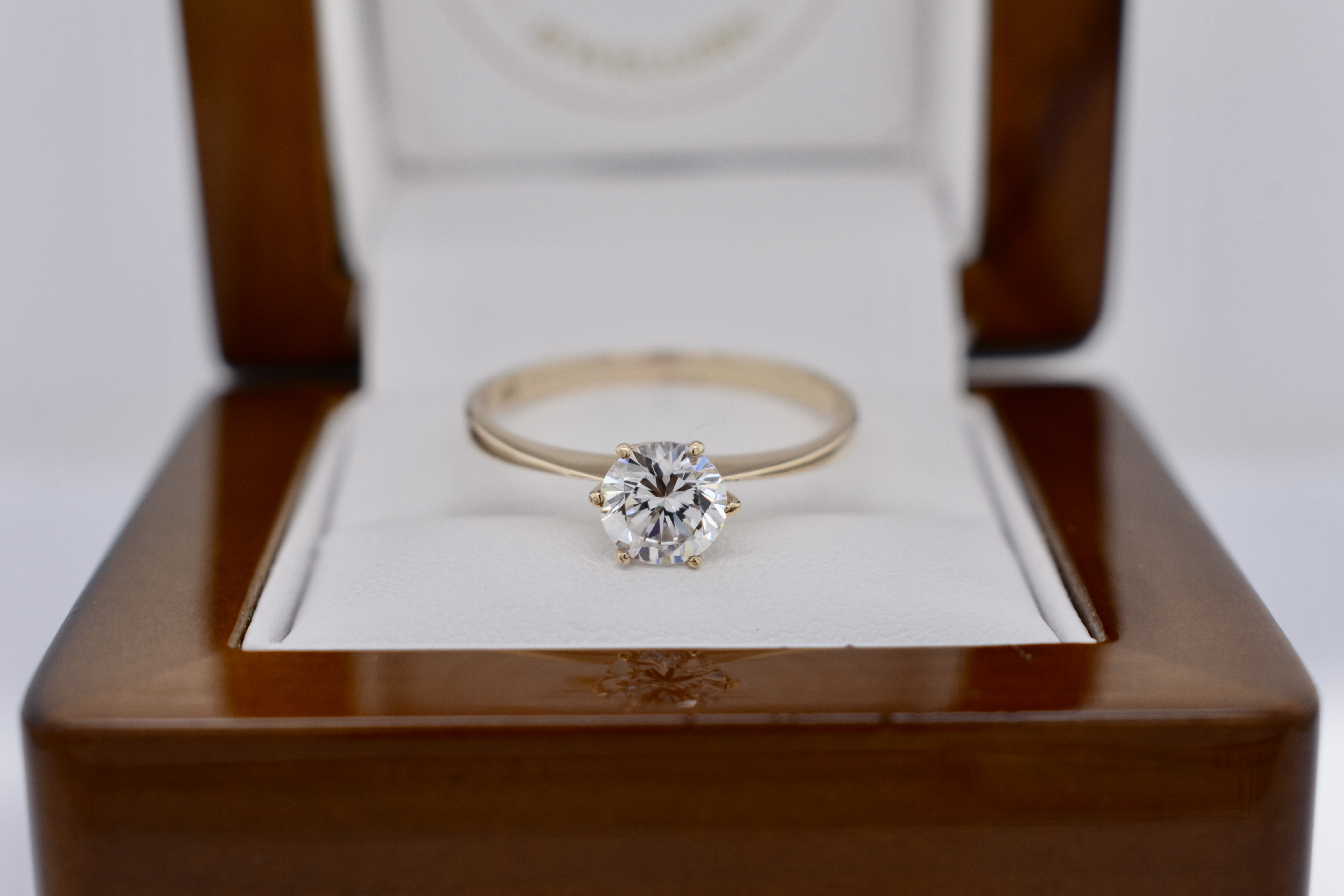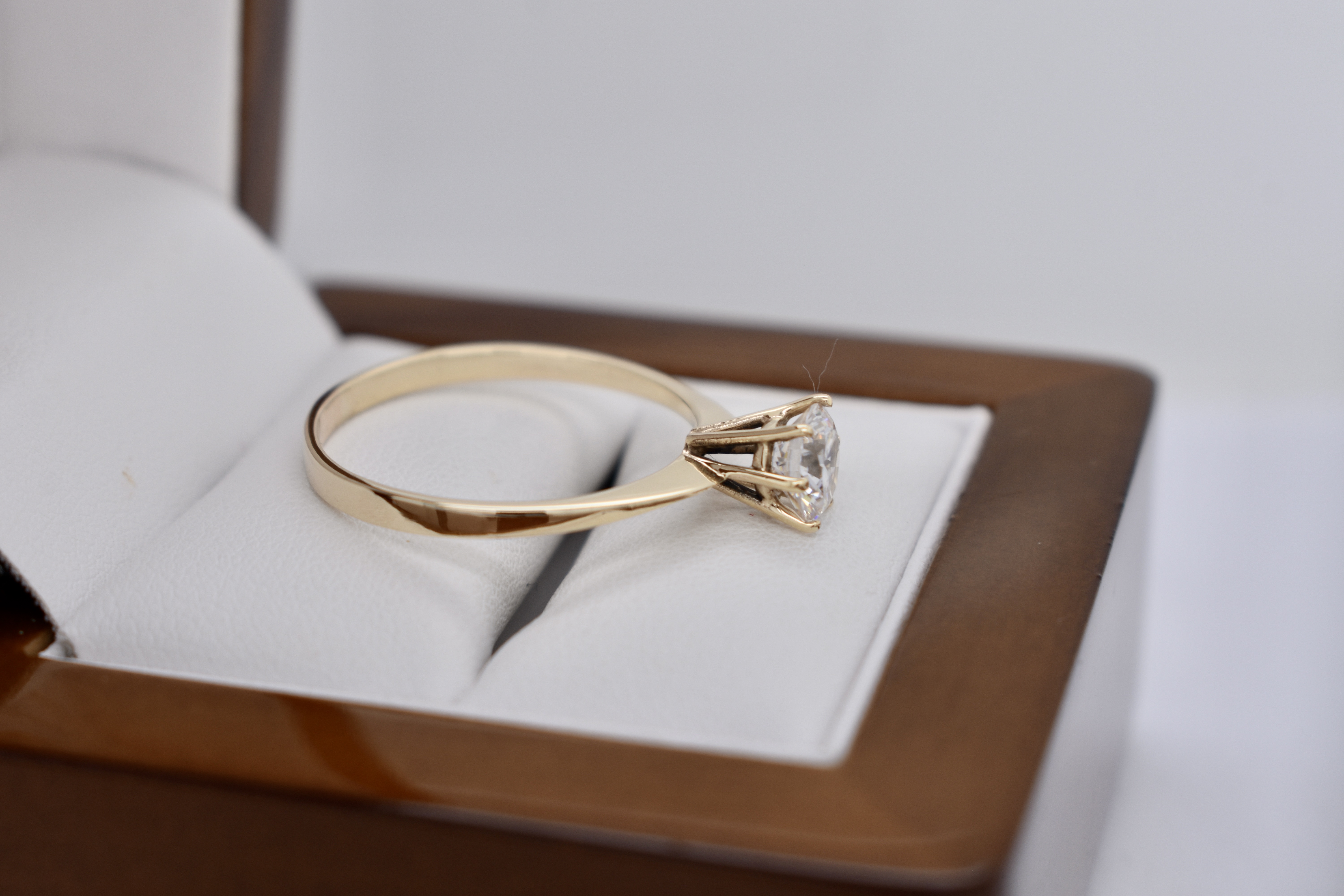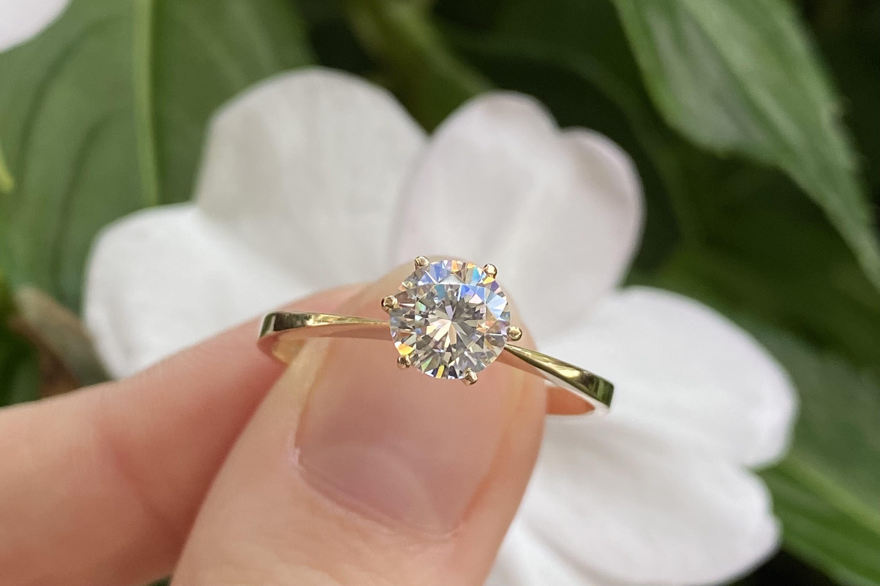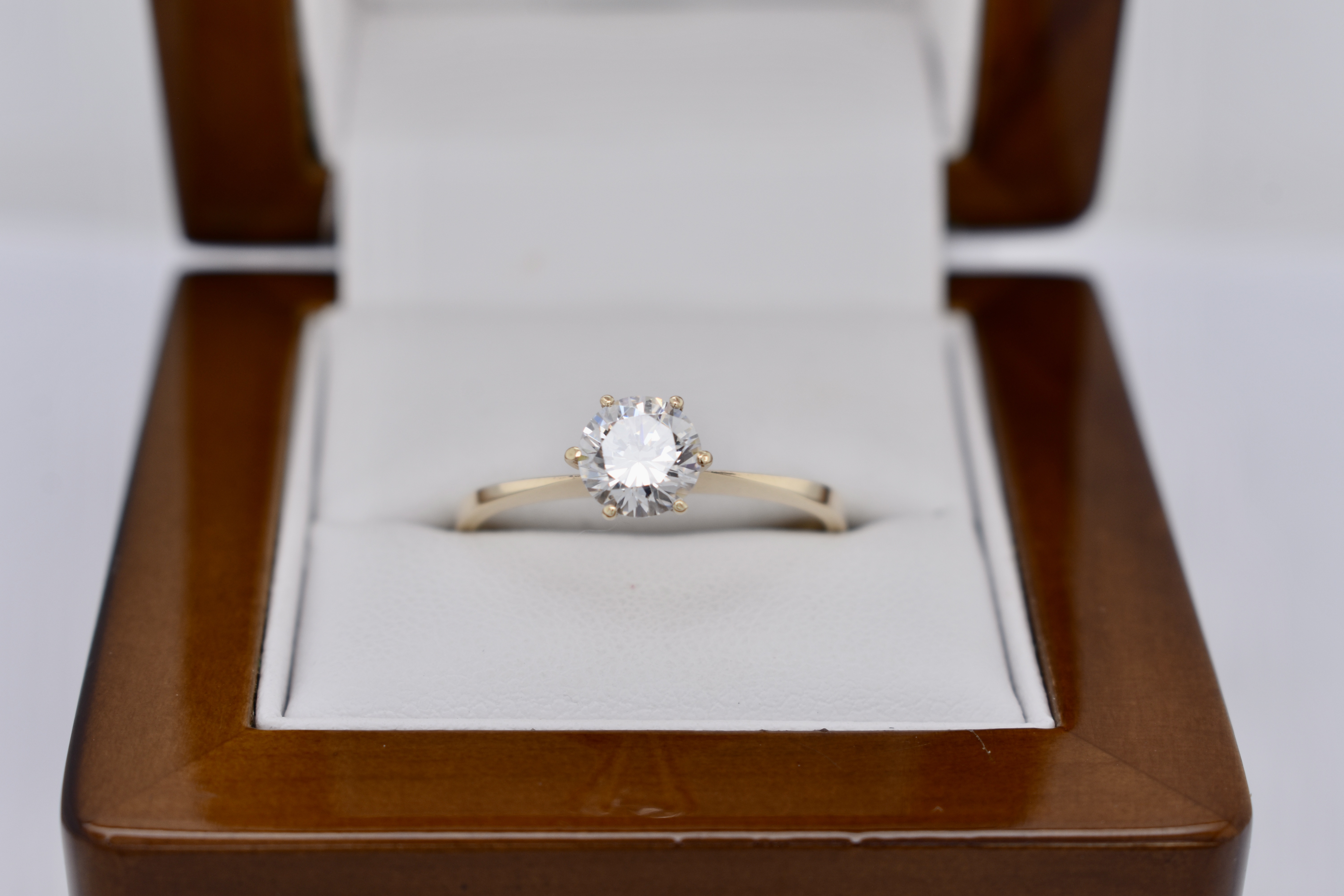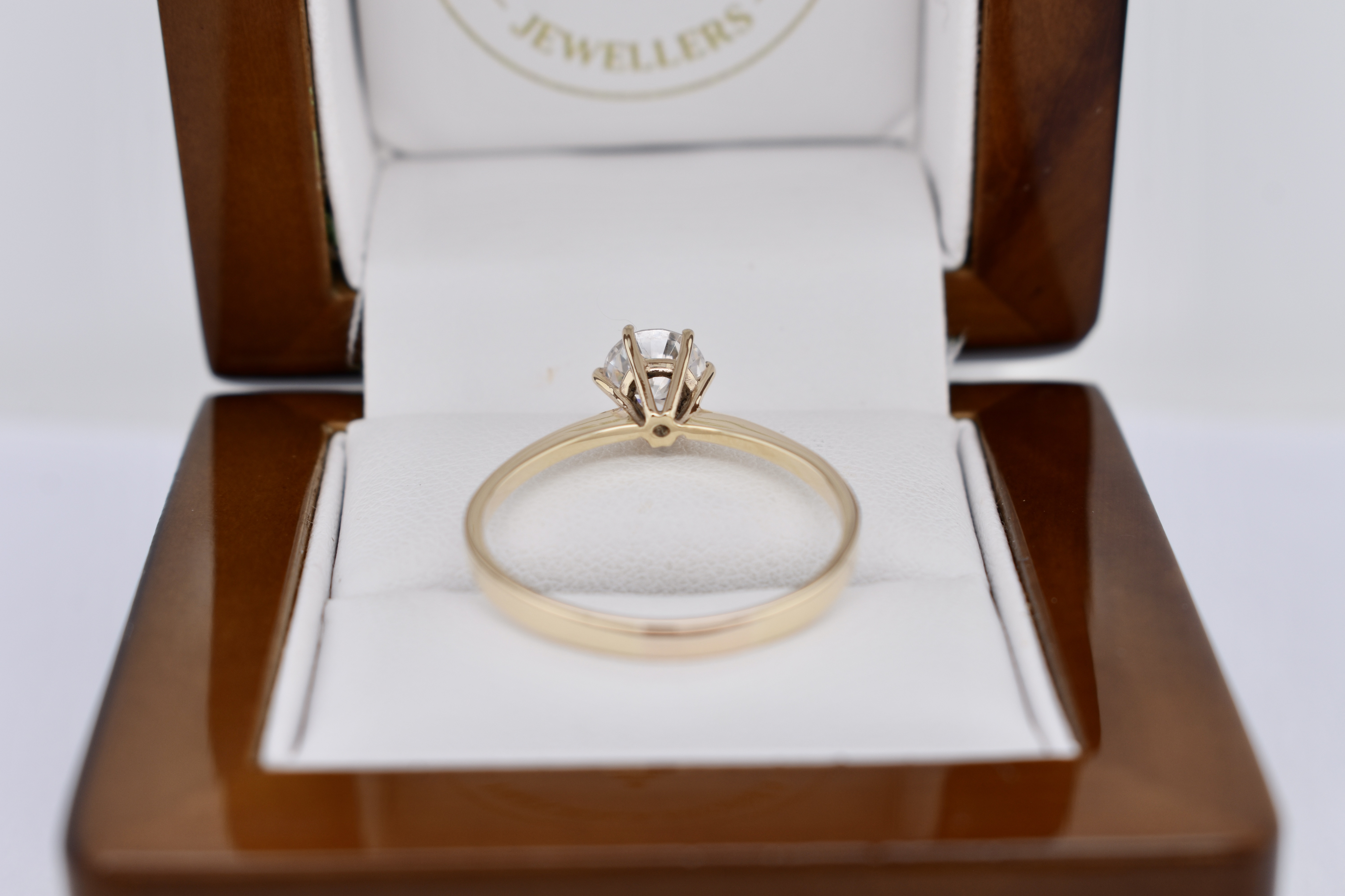 Beautiful vintage 9ct yellow gold soliatre cubic zirconia ring featuring one round 6.5mm synthetic cubic zirconia, six claw set, on a plain band. Finger size V+.