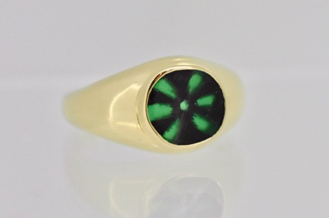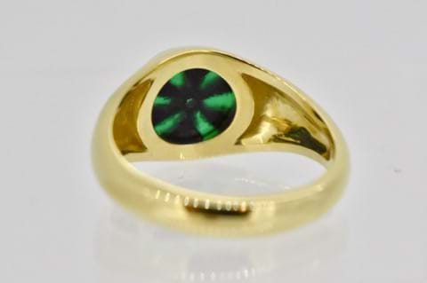 Trapiche Emeralds are the rarest of all the types of Emeralds. Known to be regional to Colombia, these amazing gems are hard to find. This particular stones was sourced specifically for its gem enthusiast owner. Set in solid 18ct gold it was designed to display and highlight the uniqueness of the gemstone and the bezel setting to protect the stone from wear.